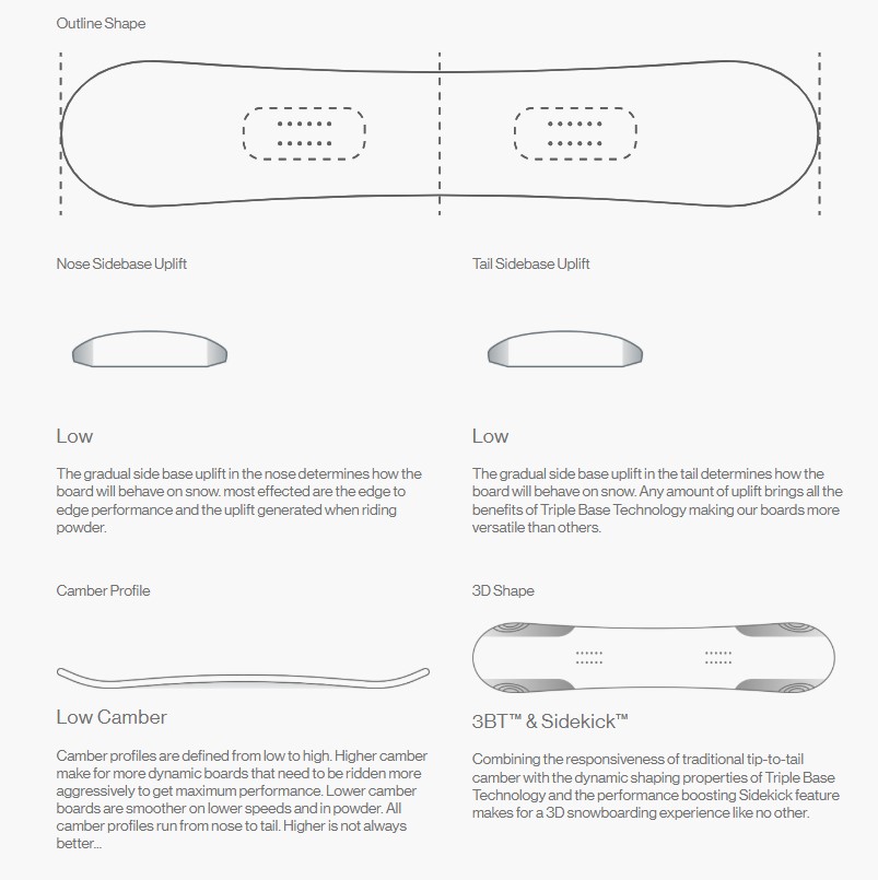 - 3BT™ & SideKick™ Technology: 3D uplifted contact points reduce edge-catch and smooth out turn initiation while maintaining positive camber energy and stability.