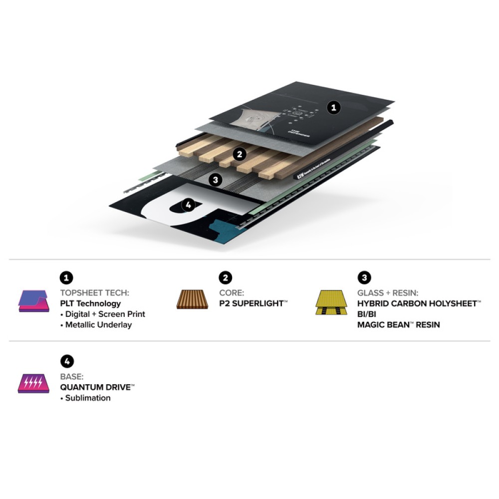 Under the hood: The ultra light P2 Superlight™ Core powers explosive pop, while the Holysheet™ lay-up with Carbon Boosters gives you snap, durability and refined flex.