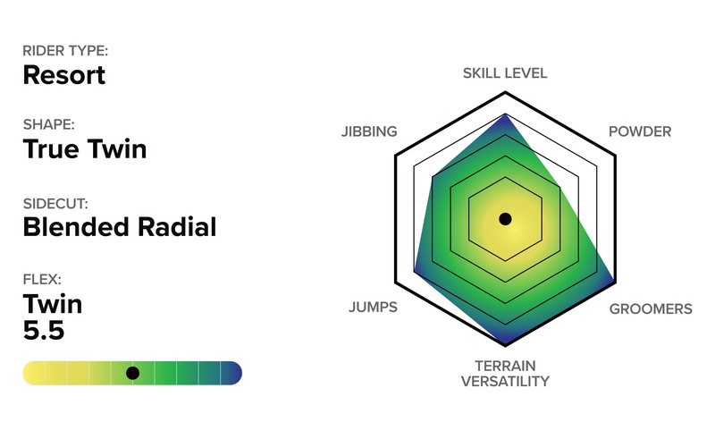 - Resort V1 + Flat Kick Tech camber profile - pop and control underfoot, flat zones for smoother landings and presses.