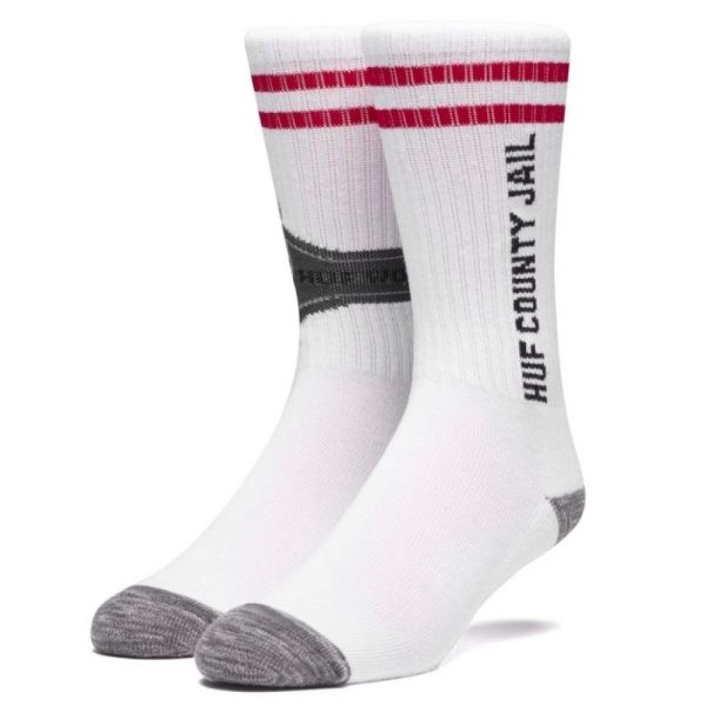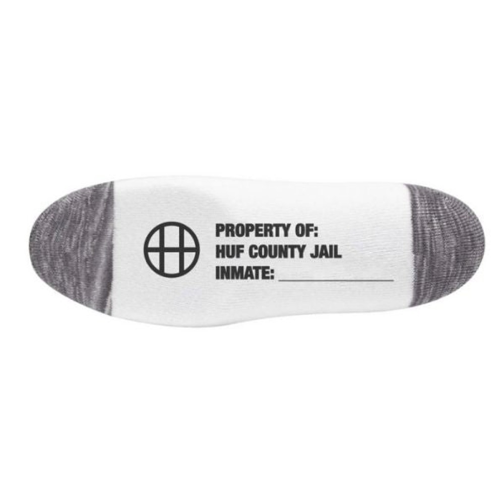 The House Arrest Sock features retro athletics-inspired double stripes at the ankle cuff, a faux electronic ankle bracelet on the right foot, and HUF County Jail verbiage at the left foot. A reinforced heel and toe in premium mélange yarn provide durability, while the sock is finished with a cushioned footbed for extra comfort.