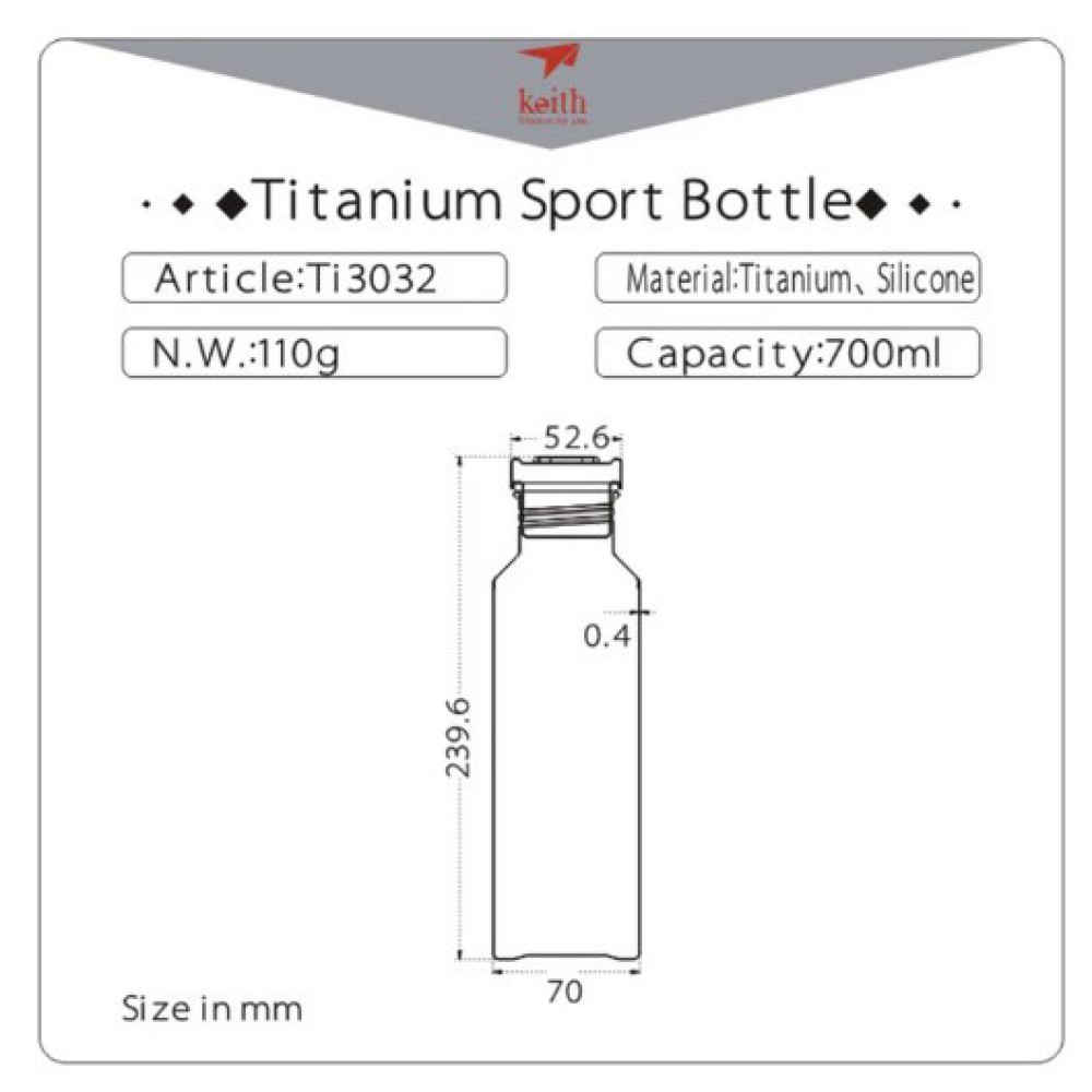 Keith Titanium sports bottles embody excellence for outdoor enthusiasts. Made from biologically safe titanium, these bottles offer a unique combination of light weight, high strength, hardness and environmental friendliness. Pure titanium is non-toxic, harmless to the human body, and suitable for long-term use.