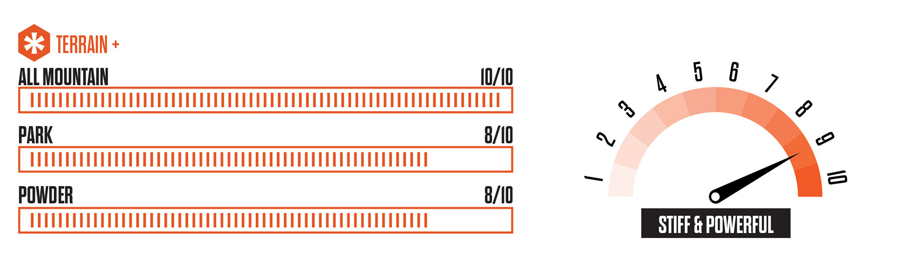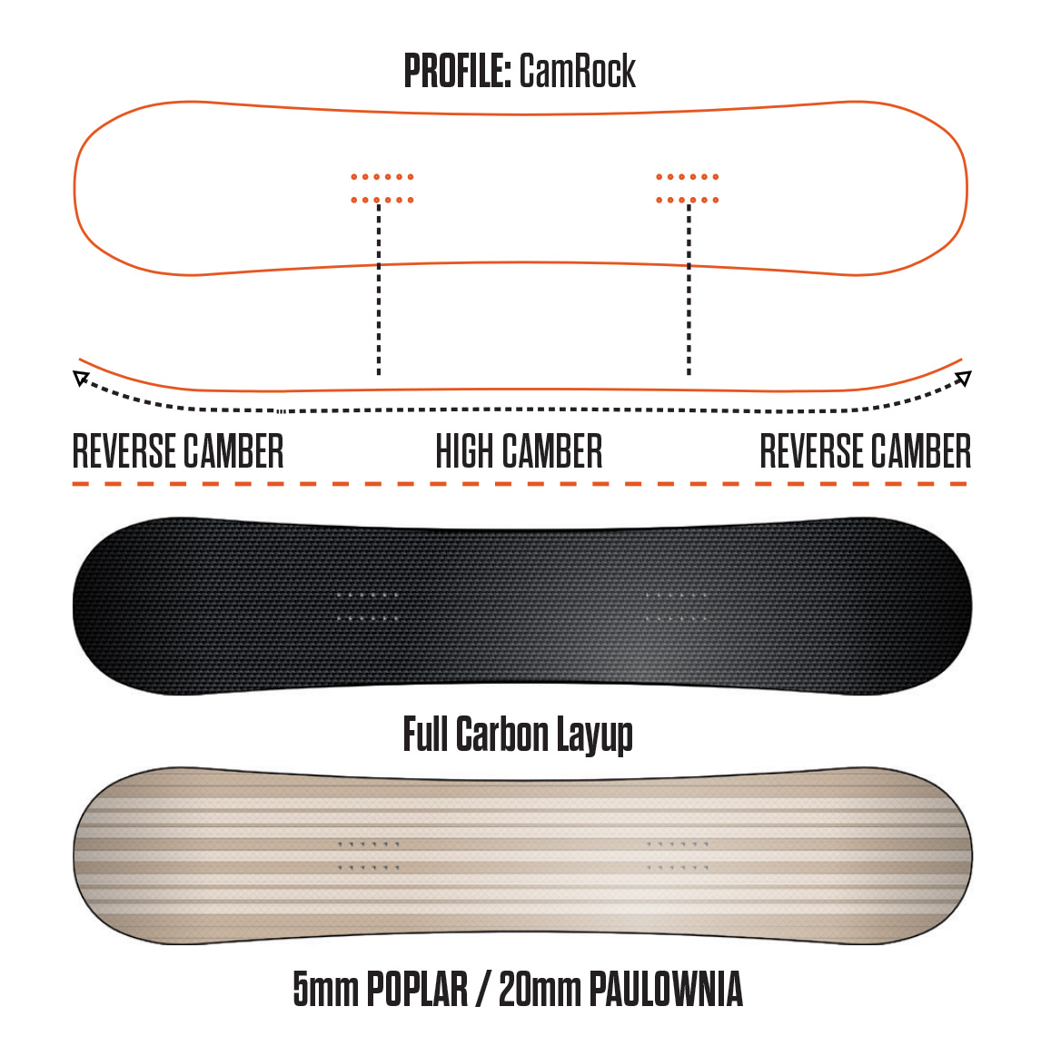 Full carbon all-mountain snowboard with stiff flex, directional twin shape and explosive power for aggressive charging.