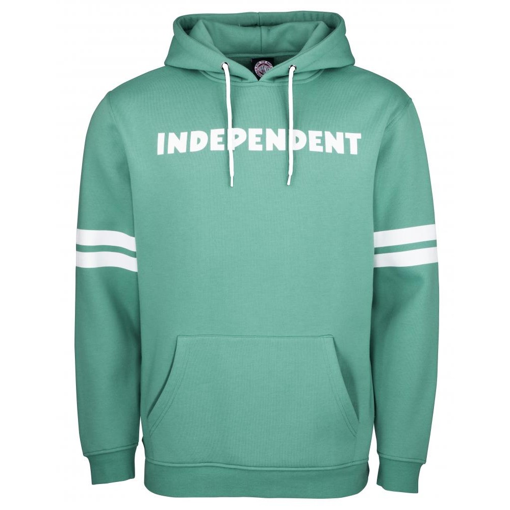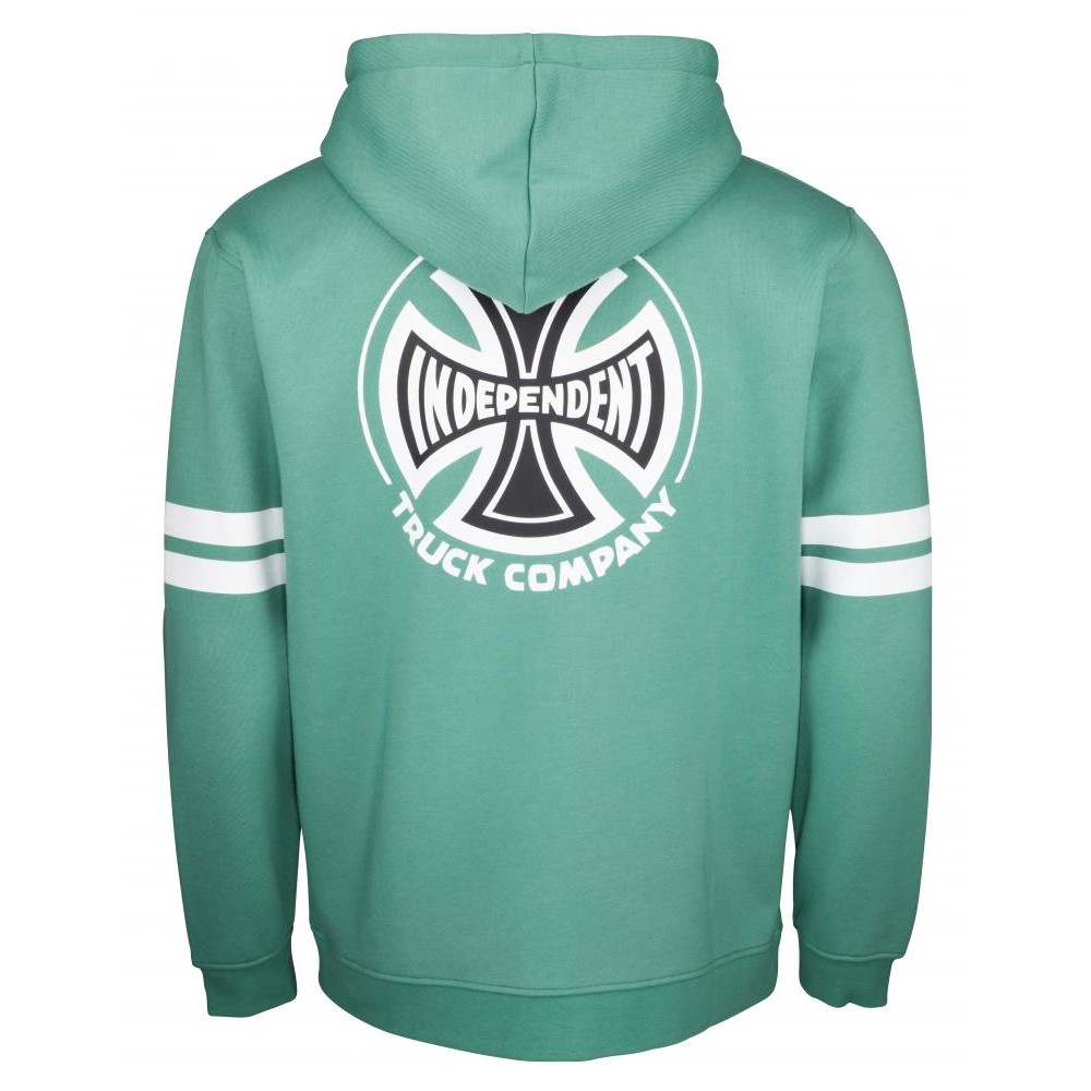 Regular fit custom 10 oz. heavyweight fleece pullover hoodie sweatshirt with patch on dual stripes on left and right sleeves, patch on kangaroo hand pockets, front Independent Bar logo print, back Truck Co. logo print.