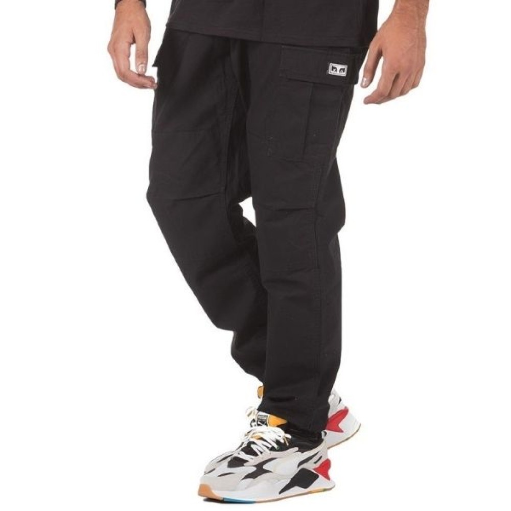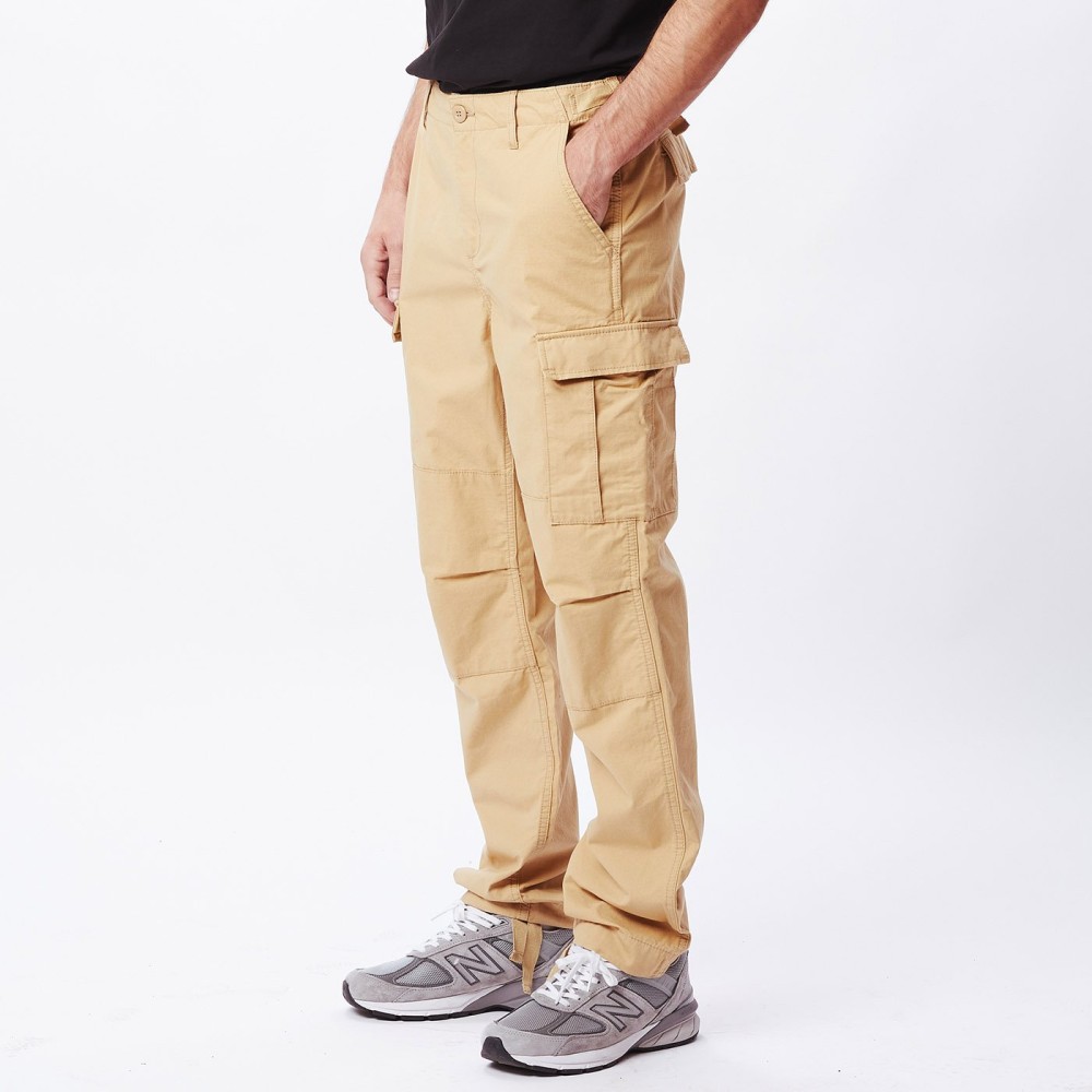 Standard fit cotton ripstop cargo pant with button and zipper fly closure at centre front. Features slash front pockets, adjustable waistband tabs, cargo pockets, back welt pockets, contrast interior details, reinforced knee patches, and herringbone twill tape ties at leg openings. INCLUDES OBEY MIL SPEC SCREEN PRINT AT EXTERIOR CARGO POCKET FLAP AND SPECIALTY LABEL AT INTERIOR WAISTBAND.