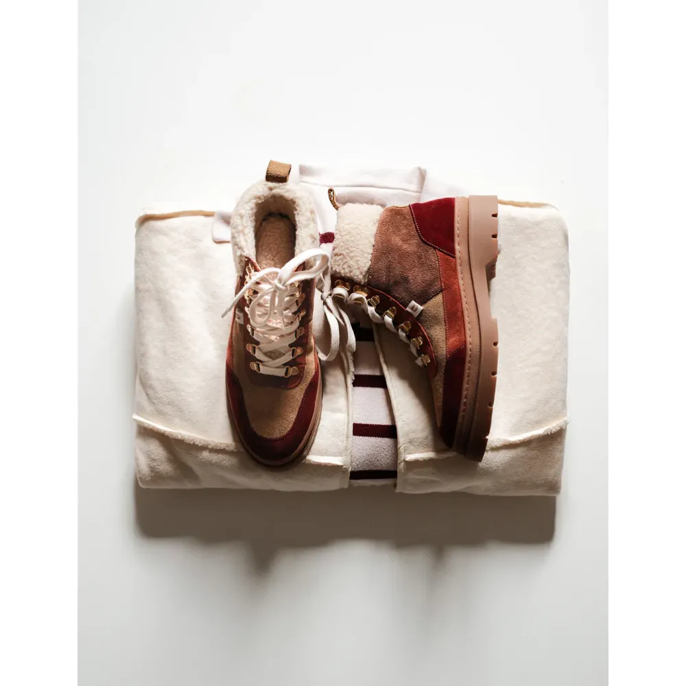 Designed with a bordeaux, beige, and terracotta suede upper and a cozy synthetic fur lining, these boots combine modern aesthetics with all-season performance.