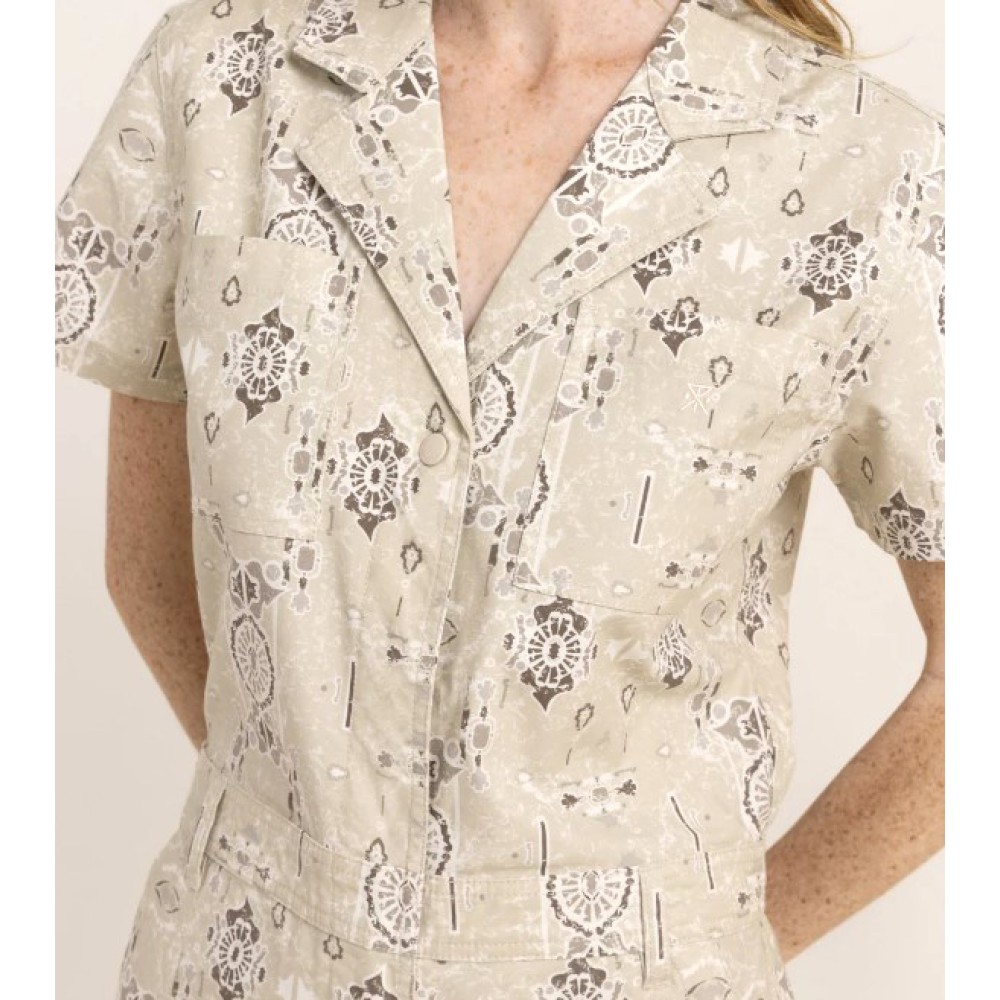 Our mechanic-inspired zip-up jumpsuit for the hot days: camp collar and short sleeves mixed with numerous usefull pockets and nice Sardinian patterns on a comfortable and durable stretch Cotton/Nylon blend. Every adventure needs a layover – jumpsuit.
