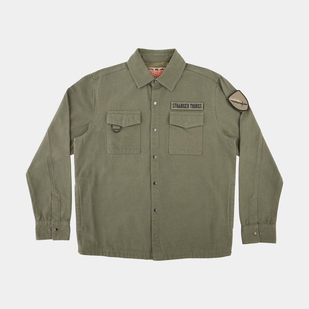 Built for the street but inspired by Hawkins, this mid-weight canvas army jacket combines utility and attitude: changeable patches, bold graphics and standout detail make it a statement piece.