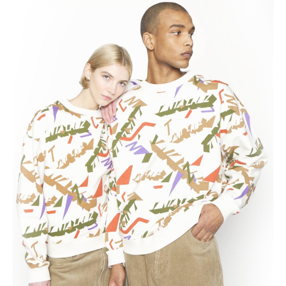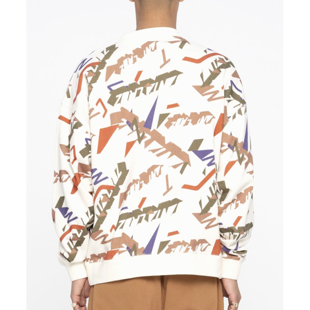 - All-over “stacked” graphic print for strong visual impact.